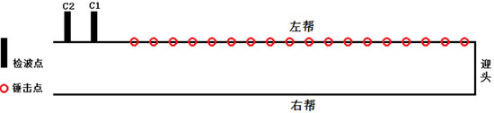 震波超前探测(MSP)技术方法主要控制掘进巷道前方构造发育情况,MSP在现场施工时每次由迎头退后均匀布置24个锤击激发点,锤击激发点间距约1m;两个接收点,接收点采用外挂三分量检波器接收,外挂三分量检波器可固定在巷道支护锚杆上;测点布置时,激发点与接收点均布置在巷道左帮,其中激发点间距约为1m,接收点间距约2.5m,详细见图3-2现场施工测点布置图。