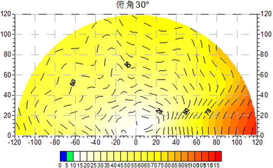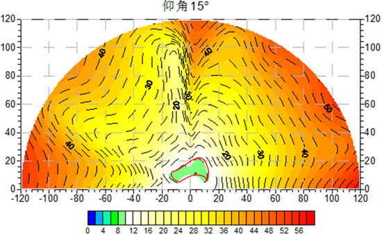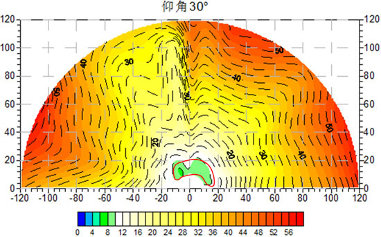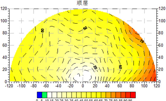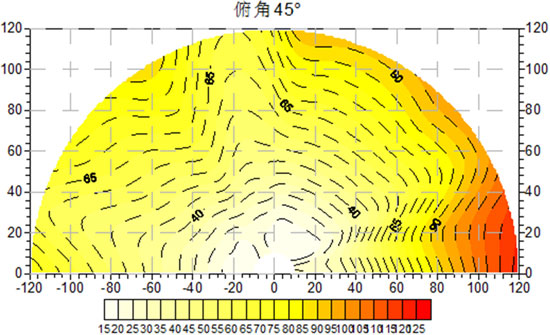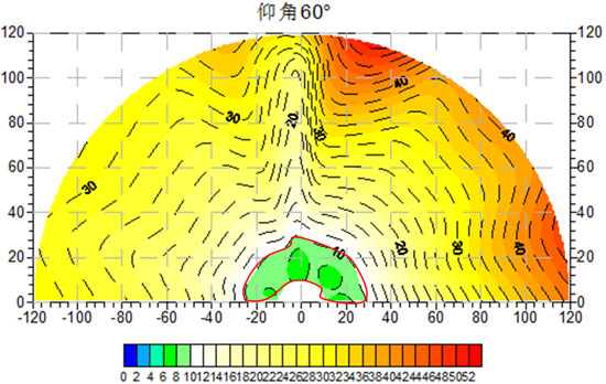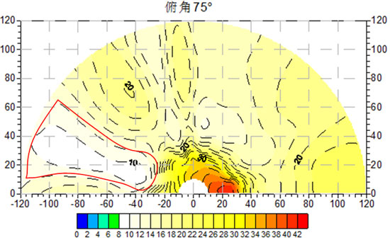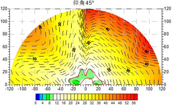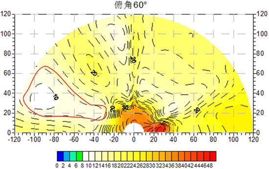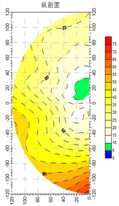 图4-1为迎头超前瞬变电磁探测仰角60°方向视电阻率等值线图,线框布置从巷道左侧旋转至巷道右侧,可以了解仰角60°方向视电阻率分布情况;由图可知仰角60°方向视电阻率值介于6-52Ω.m之间,发现一处相对低阻区域,位于迎头X轴-20~20m,Y轴0-20m范围内;仰角45°方向视电阻率值介于6-56Ω.m之间,发现一处相对低阻区域,位于迎头X轴-20~20m,Y轴0-20m范围内;仰角30°方向视电阻率值介于6-56Ω.m之间,发现一处相对低阻区域,位于迎头X轴-15~20m,Y轴0-20m范围内;仰角15°方向视电阻率值介于6-56Ω.m之间,发现一处相对低阻区域,位于迎头X轴-20~15m,Y轴0-20m范围内;顺层方向视电阻率值介于16-50Ω.m之间,视电阻率值整体较高;俯角15°方向视电阻率值介于12-46Ω.m之间,视电阻率值整体较高;俯角30°方向视电阻率值介于16-46Ω.m之间,视电阻率值整体较高;俯角45°方向视电阻率分布情况;由图可知俯角45°方向视电阻率值介于10-36Ω.m之间,视电阻率值整体较高;俯角60°方向视电阻率值介于14-30Ω.m之间,视电阻率值整体较高,但局部视电阻率值存在梯度变化,位于X轴-120~-40m、Y轴20~60m范围内;俯角75°方向视电阻率值介于10-30Ω.m之间,视电阻率值整体较高,但局部视电阻率值存在梯度变化,位于X轴-120~-30m、Y轴0~60m范围内;纵剖面视电阻率值介于18-48Ω.m之间,视电阻率值整体较高,发现一处相对低阻区域,位于X轴0~30m、Y轴0~30m范围内;