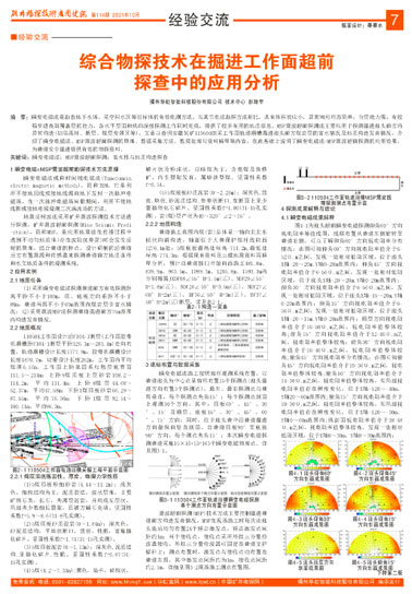 本次瞬变电磁探测,仰角60°方向、仰角45°方向、仰角30°方向、仰角15°方向均以及纵剖面方向均各发现一处相对低阻区域,与顶板砂岩裂隙发育,局部富水有关;俯角60°方向、俯角75°方向均发现视电阻率值存在梯度变化区域,表示该区域富水条件发生了变化。