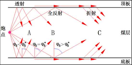 在含煤地层中,煤层是一个相对低速的地震槽。煤层与围岩间的界面,一般呈现良好的反射面,煤层与其顶底板围岩相比总是以低速度、低密度,从而以低波阻抗出现。在煤层中激发地震波,所激发的纵波、横波均以震源为中心,以球面体波形式向四周传播,并以不同的角度入射到顶底板界面,如图2-1。当入射角小于临界角时,大部分能量将透射到围岩之中,只有少部分能量能量反射回到煤层中,返回到煤层的能量,在煤层来回多次反射、透射而迅速衰减(漏失模式);当入射角大于等于临界角时,则入射到顶、底板界面的的地震波能量将全反射回到煤层,并在煤层中多次反射,最后禁锢在煤层之中(正常模式)。地震波在煤层这个低速槽内向外扩散传播,其中上行、下行波在煤层中相互干涉、迭加,多数谐波成分相互抵消、削弱,而逐渐消失;只满足一定条件的各种谐波,在槽内相长干涉而形成垂直于煤层面的驻波,在煤层内不断向前传播,这就形成了槽波(channel waves),也称煤层波(seam waves)。