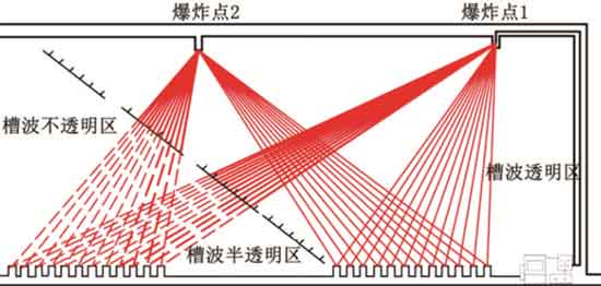 槽波透射法所用的有效波是从震源透过煤层传至接收点的直达槽波信号。如图2-2所示,炮点与检波点(接收点)布置在采区周围不同巷道内。根据槽波的有无、强弱来判断在相应的透射射线扇形区内有无构造异常。