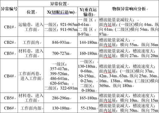 (1)通过槽波透射地震勘探共得到6处工作面内部地质异常区,编号为CB1#~CB6#,其中CB1#范围:X方向切眼后退911-965m,Y方向垂直运输巷0-97m;CB2#范围:X方向切眼后退846-931m,Y方向垂直运输巷144-180m;CB3#范围:X方向切眼后退700-727m,Y方向垂直运输巷160-180m;CB4#范围:X方向切眼后退322-691m,Y方向垂直运输巷0-180m;CB5#范围:X方向切眼后退286-296m,Y方向垂直运输巷165-180m;CB6#范围:X方向切眼后退130-180m,Y方向垂直运输巷55-130m。