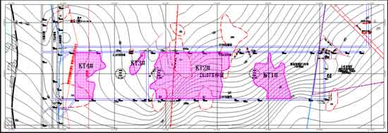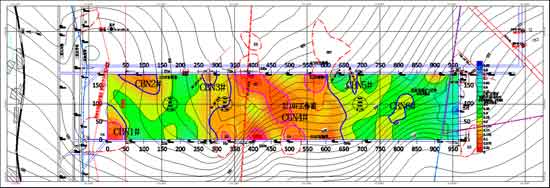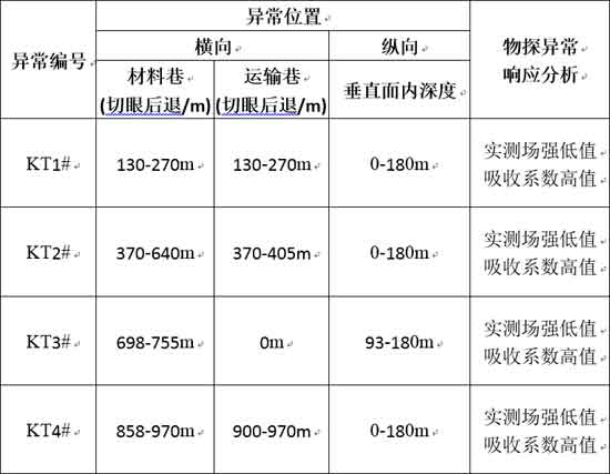 据实测场强曲线值变化特征、吸收系数、实测场强CT成像图、地质资料和现场情况综合分析,本次探测区域内存在4处异常区,并编号为KT1#~KT4#。具体如表5-2及图5-3与图5-4所示。