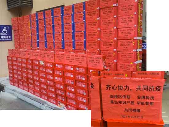 3月22日下午,在鼓楼区侨联的带领下,华虹智能与安博科技、景弘知识产权一起,向五凤街道的一线工作人员,捐献了方便面、八宝粥共计260箱。希望通过实际行动,共同筑牢疫情防线,为打赢疫情防控阻击战贡献一点绵薄之力。