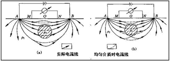将直流电源的两端通过埋设地下的两个电极A、B向大地供电,在地面以下的导电半空间建立起稳定电场,通过接收电极M、N观察稳定电场的变化和分布。如果地下存在导电性不同的岩层和矿体,它们会影响电场的分布,良导体对电流有“吸引”作用,导电性差的则对电流有“排斥”作用。因此,当地下存在导电性差的地质体时,由于它对电流的“排斥”作用,使电流远离它本身而流过;而当地下存在有良导体时,它将对电流有“吸引”作用,使大部分电流通过其本身。这样,在地表观测到的电场将发生畸变,通过对畸变电场的分析,判断地下不同导电性地质体的赋存状态。
