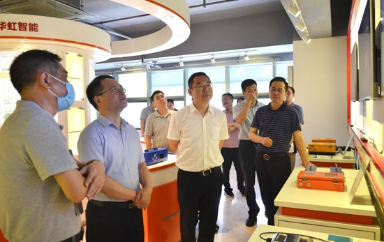在公司展厅,董事长陈春江向鼓楼区委书记黄建新介绍了华虹目前主要产品和公司所从事的一系列工作。