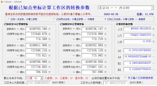 在“万能坐标转换”工具中选择“北京54—西安80”,利用布尔莎七参数转换模型进行高精度计算,得到参数计算结果(图4.3-1)。