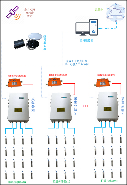 矿用微震监测系统,是一套满足微震监测矿山安全灾害监测系统。通过高精度中低频微震监测系统,可实时、精确给出煤岩体破裂或失稳的空间位置。系统主要采集与分析服务器、授时服务器、KDW127/18B矿用隔爆兼本安型直流稳压电源、KJ1465-F矿用本安型微震监测分站、GZC28矿用本安型拾震传感器及其它必要设备组成。