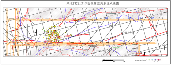 对此工作面的微震监测数据进行统计分析,从平面图来看,认为微震事件主要分布在工作面前方150m范围,见图3-3工作面微震事件平面图,主要是由工作面生产活动诱发引起的岩石微破裂信号。在FS857、FS466断层处,微震事件也表现得比较密集。