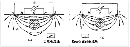 将直流电源的两端通过埋设地下的两个电极A、B向大地供电,建立起稳定电场(如图2-1),通过接收电极M、N观察稳定电场的变化和分布。如果地下存在导电性不同的岩层和矿体,它们会影响电场的分布,良导体对电流有“吸引”作用,导电性差的则对电流有“排斥”作用。因此,当地下存在导电性差的地质体时,由于它对电流的“排斥”作用,使电流远离它本身而流过;而当地下存在有良导体时,它将对电流有“吸引”作用,使大部分电流通过其本身。这样,在地表观测到的电场将发生畸变,通过对畸变电场的分析,判断地下不同导电性地质体的赋存状态。