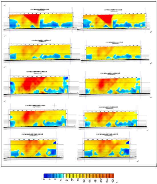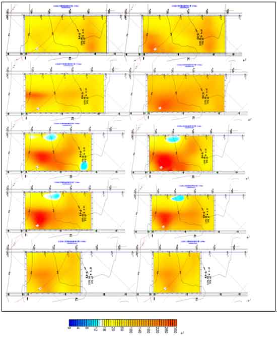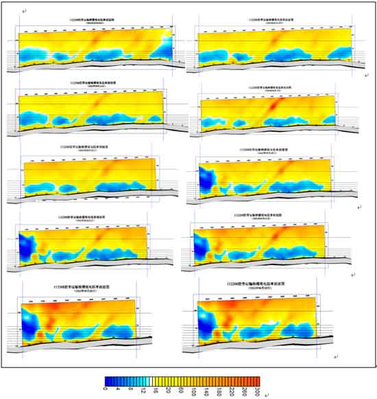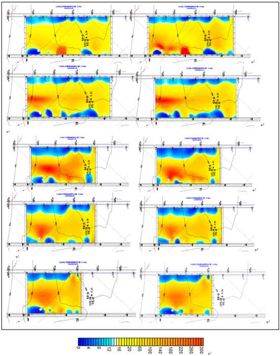 图4-4 112208工作面顶板深部99m段电阻率反演切片(6.08~6.28)