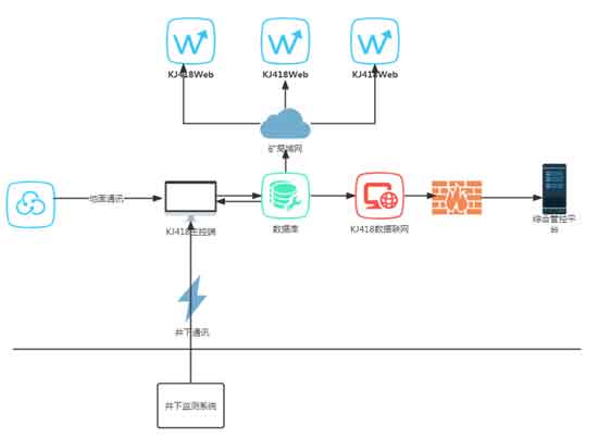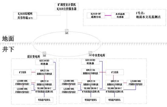 设计架构:山西某煤矿水文监测预警系统基于井下工业网,总体架构由三部分组成。①地面部分有中心主站1套,主站主要由工控机、数据采集软件、数据处理软件和软件发布系统组成;②井下部分有主要有3台分站和8台传感器组成。井下8台传感器分别为:3台明渠流量监测、5台管道流量监测。③地面液位有长观孔监测1套,包含水文遥测分站1台和5参数水质传感器1台。
