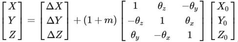 式中,∆X、∆Y、∆Z为三个平移参数;θx、θy、θz为3个旋转参数,m为尺度参数。