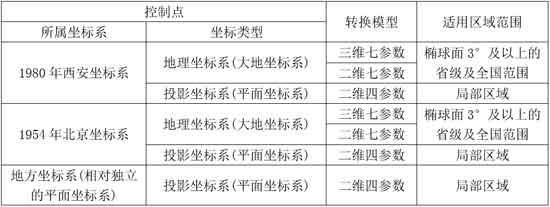 (2)对于不同大地坐标系之间的转换则需要注意:在不同的坐标系统之间,由于椭球参数不同,两个椭球之间没有一种统一的方法实现坐标转换。但是,在两个椭球所指的同一区域内,由于椭球面弯曲度较小,该区域同名点在不同的椭球系上存在一定的曲面数学关系,因此可以通过区域转换模型进行坐标转换。一般常用的转换方法是四参数转换法和七参数转换法。