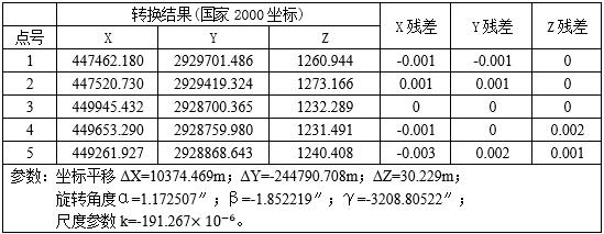 本次选取某矿西安80坐标系和国家2000坐标系下的5个控制点坐标(表3和表4),利用coord4.1坐标工具对两种坐标系下的坐标进行七参数转换(表5)。