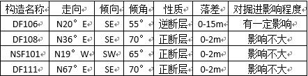 纵观本面,煤层整体发育为一北高南低的单斜构造形态,中部发育次一级的向背斜相间的褶曲造形态,煤层倾角2º-10º,平均5º。根据三维地震解释报告,工作面发育4条断裂构造,预计揭露情况如下;