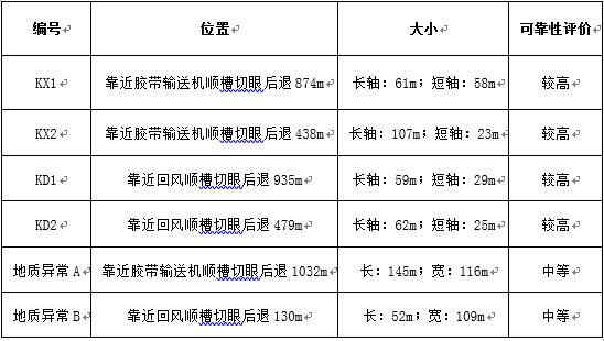 根据无线电波透视探测实测场强曲线值变化特征、反演成像图和矿方提供地质资料综合分析,本次无线电波透视法探测共修正已揭露陷落柱2个,分别为KX1、KX2;解释推测陷落柱2个,分别是KD1、KD2;推测地质异常体区域2处,分别是地质异常A、地质异常体B。