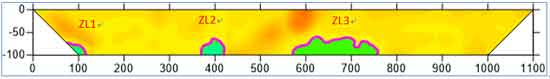 ZL3位于横坐标570~760m,纵坐标-55~-100m,视电阻率相对较低。