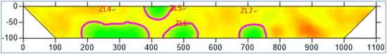 ZL7位于横坐标680~760m,纵坐标-55~-100m,视电阻率相对较低。