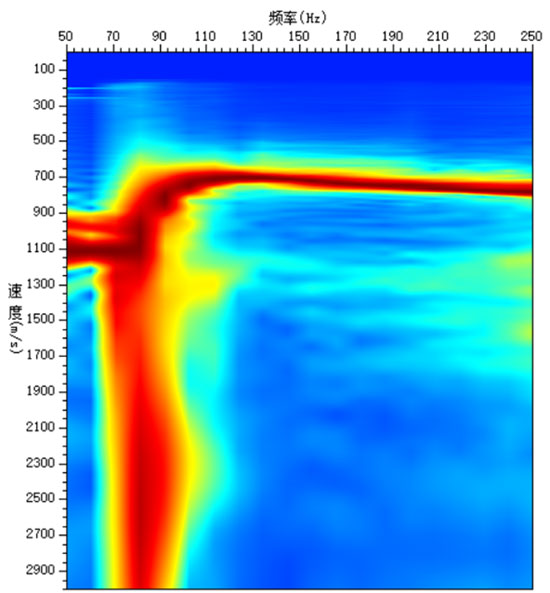槽波是典型的频散波,即槽波的速度随频率的改变而变化。在估计出围岩与煤层纵横波速度等参数后,计算出的单炮槽波频散曲线如图4-2所示。从图中可看出,埃里相在90Hz附近,槽波大部分能量分布均集中埃里相附近。实际数据中包含各种频率的噪声,但其噪声成分主要在0~80Hz范围以内,对本次数据处理影响不大。