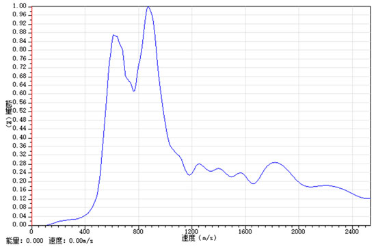 (7)速度分析地震道记录的信号由多种波相组成,比如初至区的折射P波和折射S波,但不同波列信号在传播时有速度差异,相比之下,槽波具有相对较低的波速,通过分析震源信号的速度区间,可通过利用速度来达到槽波提取以及信号分析解释的作用。图4-3为单炮地震道槽波速度分析曲线图,可以看出,槽波的主要速度集中在500-1200m/s左右。