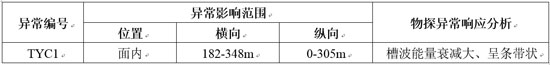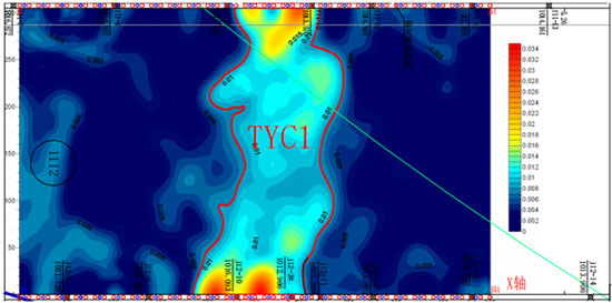 利用槽波能量衰减系数成像,通过对槽波能量衰减系数高值区的圈定进而能推断工作面面内可能存在的地质构造发育区。图4-2为XX工作面槽波地震勘探能量衰减系数成像图,图中暖色代表衰减系数大,此处为槽波衰减高值异常区,冷色代表衰减系数小。本次槽波透视共圈定1处能量衰减系数高值异常区,异常编号标识为:TYC1#,槽波透视勘探物探异常分析见表4-1
