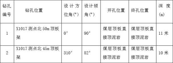 本次钻探在9110工作面回风顺槽X1017测点北45-50m设计2孔,旨在探明顶板岩性变化及观测顶板裂隙,具体设计如下: