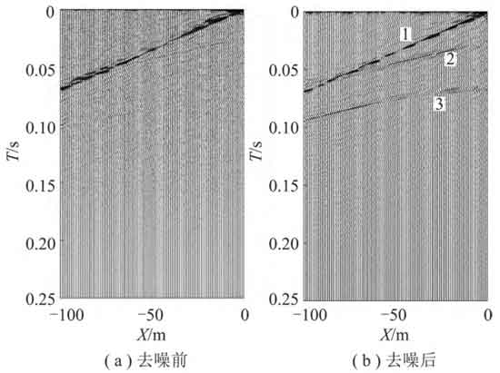 对于随掘地震信号脉冲化处理,F. Poletto 等[14]提出了一种利用 TBM 随机振动自相关干涉进行超前探测的方法;程久龙等[15]采用基于改进人工蜂群的独立分量分析方法(IABC-ICA)进行噪声与有效信号的分离,在此基础上利用互相关和脉冲反褶积方法进行压缩子波处理,图3为该方法去噪前后脉冲反褶积处理结果;覃思等[16]、许新骥[17]、U. Harmankaya 等[18]、王季等[19]开展了基于互相关方法的随掘地震超前探测试验研究。