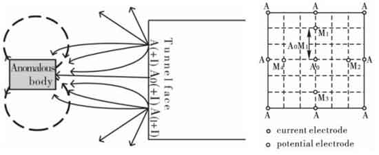 (a)聚焦电流法隧道超前探测原理 (b)电极布置
