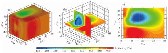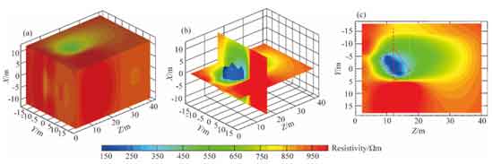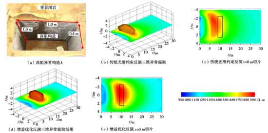 随掘电法受限于观测模式及掘进机的干扰,易造成反演成像多解性,影响异常体定位精度。针对多解性和运算速度问题,王传武[30-32]通过在三维电阻率反演中利用已知的地质信息,施加基于松弛变量的不等式约束来压制反演的多解性,图8展示了物理模拟试验中反演计算结果;