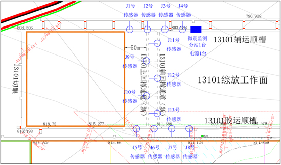 工作面微震监测长度50m,结合工作面实际监测长度,在辅运顺槽、胶运顺槽各布置4个传感器,拾震传感器间距为40m;另外在主回撤通道布设2个传感器,在辅回撤通道布设3个传感器,拾震传感器间距为80m,监测系统布置如下图: