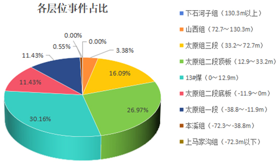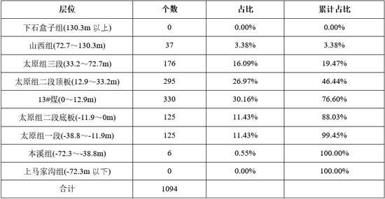 4、监测成果某矿某工作面微震监测于2025年8月29日开始监测,于2025年9月8日停止监测。共计监测11天,微震事件1094个。监测期间微震系统运行状况良好,信号连续,基本无长时间数据中断,事件日变化情况如图4所示。监测期间各层位占比如表图5所示,微震事件空间上集中发育在太原组二段顶板、太原组三段、太原组二段底板和太原组一段层段。