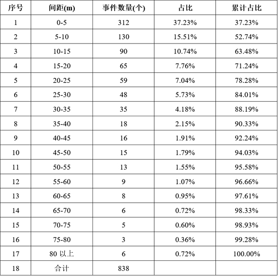 微震事件连续发育至35-40m(事件占比≥1%,累计占比≥90%),根据裂隙带岩层发育特点:“裂隙产生—裂隙扩展—岩层断裂”的过程、微震事件分布不集中,自下而上逐渐减少,大致确定导水裂隙带高度为35-40m左右。