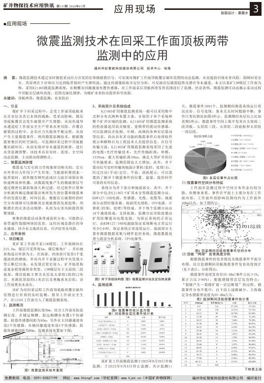 通过对某矿13#煤层工作面回采期间实施微震监测,对顶板覆岩破坏范围及演化特征进行了动态分析与评估,微震监测技术作为一种主动、高效的岩体破裂动态感知手段,能够精准、实时地揭示煤矿采动过程中顶板覆岩破坏的高度、范围及其时空演化规律。本次应用实践不仅为该工作面安全生产与水害防治提供了直接的科学依据,也证实了该技术在实际工程中用于定量评估“两带”发育特征、识别潜在导水通道的可行性与有效性,对于推广矿山动力灾害的精细化、智能化监测预警具有重要的实践价值。