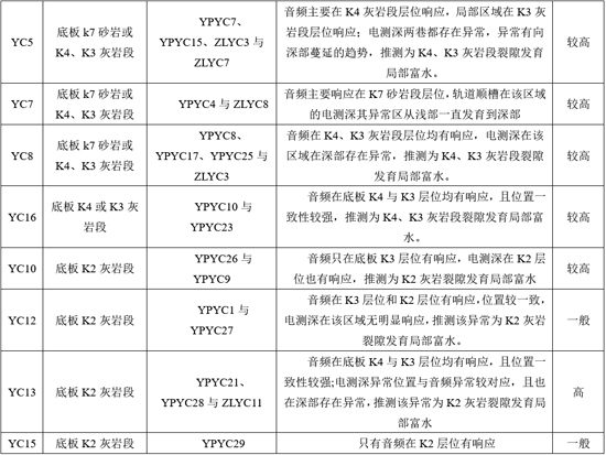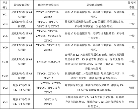 YC2异常:岩性为太原组K4、K3岩层段。井下探查疏放水孔12#、13#、施工期间钻速正常,无塌孔、卡钻、掉钻等钻探异常,钻孔出水量6.2m³/h,与物探结果相符。