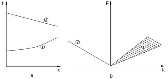 图1为F-K变换示意图,图a为t-x域,存在同相轴曲线①和曲线②,前者视速度为正,后者视速度为负,且曲线①具有多个视速度(多个切线值)。因此在F-K(图b)域中两者完全分开,曲线①的在正K区间且能量呈扇形分布,而曲线②能量在负K区间,因为有唯一视速度故仍表现为线状。