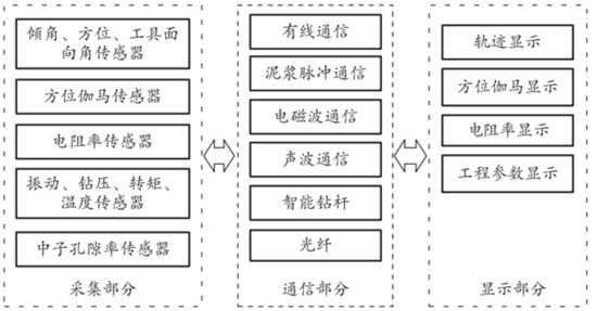 煤矿井下随钻测量系统主要用于钻孔轨迹参数测量,主要由采集、通信、显示等部分组成,如图1所示。采集部分由各种安装在钻头后方的钻杆或无磁钻杆内的传感器组成,用于测量孔内各类数据,主要包括钻孔轨迹参数(倾角、方位、工具面向角)、地质信息参数(方位伽马、电阻率、中子孔隙数据等)、工程参数(振动、钻压、转矩、转速、振动、温度等)等数据;通信部分主要是将孔底测量数据通过有线或无线的方式传输至孔口仪器;显示部分将对应的数据分析处理后,通过电脑显示出来。