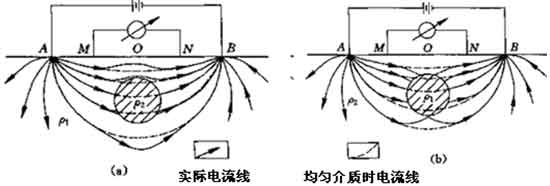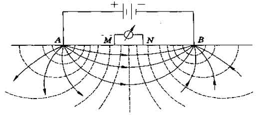 将直流电源的两端通过埋设地下的两个电极A、B向大地供电,在地面以下的导电半空间建立起稳定电场。该稳定电场的分布状态决定于地下不同电阻率的岩层(或矿体)的赋存状态。所以,从地面观察稳定电场的变化和分布,可以了解地下的地质情况。