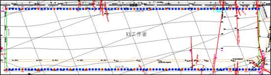 本次音频电透视法探测底板采用128Hz、64Hz、32Hz、16Hz四个频点依次采集,运顺、轨顺以与切眼相交处为探测起始测点1号测点,然后沿着巷道向停采线方向分别依次布置测点至80号测点,测点距10m,测线长度为790m。发射点距和接收点距为10m,对应巷道进行扇形扫描接收。工作面底板音频电透视法探测,布置1站采集数据,每站单巷电极数量80根,发射电极80根,接收电极80个,极距10m,每个发射点一般对应80个接收点,如图3-2、3-3音频电透视法施工布置图。