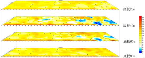 为了解影响工作面内底板85m范围内相对低阻异常区及富水区情况电性特征,利用运顺、轨顺2条巷道三维电法数据进行三维联合反演,制作了各层位视电阻率值切片图,图中不同的色调表示不同的视电阻率值,并且遵循色调从冷色调到暖色调表示视电阻率值不断升高的规律,具体如图4-1所示。