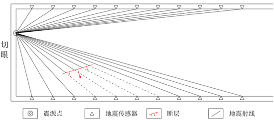 煤矿井下随采地震探测技术是指利用采煤机截割煤壁时所诱发的震动作为被动地震震源,通过在回采面两侧巷道煤帮布设随采传感器接收实时信号,利用地震勘探数据实时处理和动态成像技术,动态监测工作面内部煤层中断层、陷落柱、煤层变薄区等静态地质条件,并对监测工作面煤层顶板破碎带、应力集中区、突出危险区等动态灾变条件进行监测预警,为煤矿智能无人安全开采提供数据支撑。随采地震探测技术原理如图1所示。